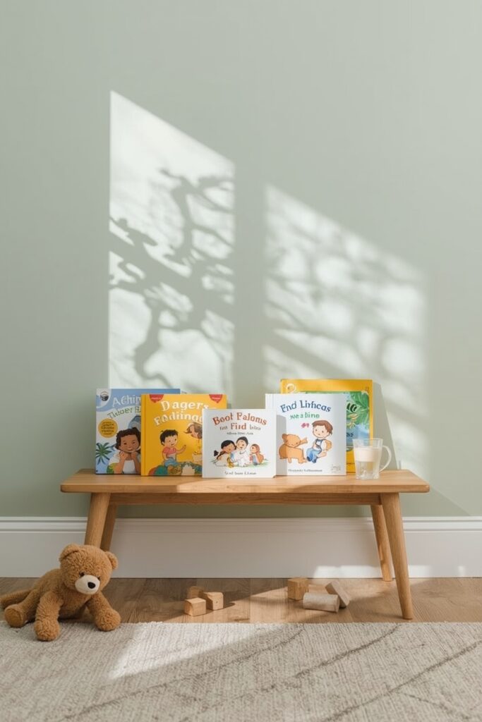 A nursery shelf looks best with a little personality, think books first, then a few sentimental pieces, not too perfect, just enough to feel loved and lived in.